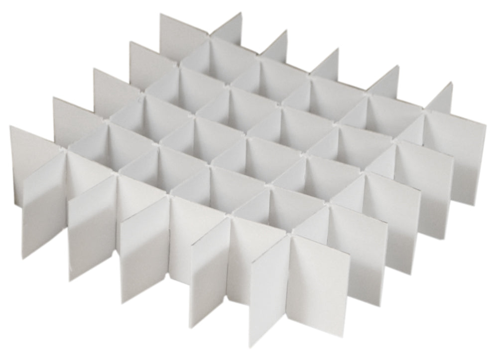 Made of .024 coated White SBS board and arranged 6 x 6 to safely hold 36 vials. The cell size is 25/32" x 25/32" (20mm x 20mm). Freezer dividers dimensions 4-7/8 x 4-7/8 x 1-1/4 inches.