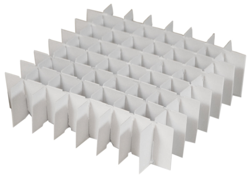 Made of .024 coated White SBS board and arranged 8 x 8 to safely hold 64 vials. The cell size is 5/8" x 5/8" (16mm x 16mm). Freezer dividers dimensions 4-7/8 x 4-7/8 x 1-1/4 inches.